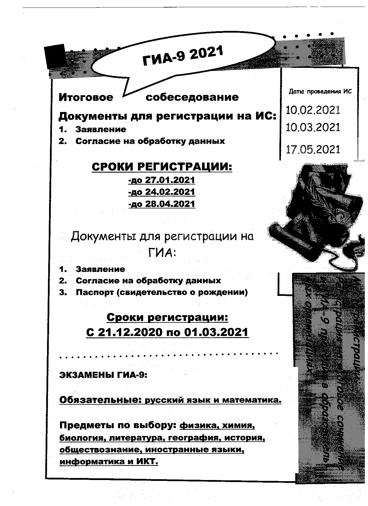 Организационная схема регистрации участников ГИА-9 и итогового собеседования по русскому языку в 9-х классах (образцы: заявления на ИС и ОГЭ/ГВЭ, согласие на обработку персональных данных и др.
